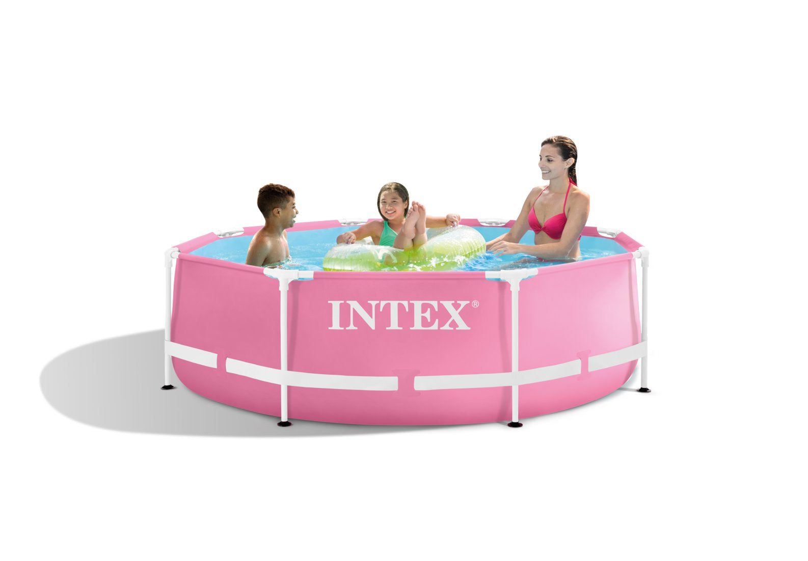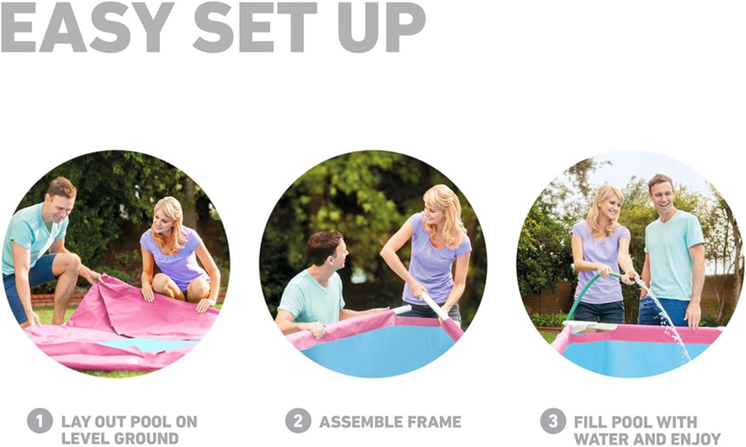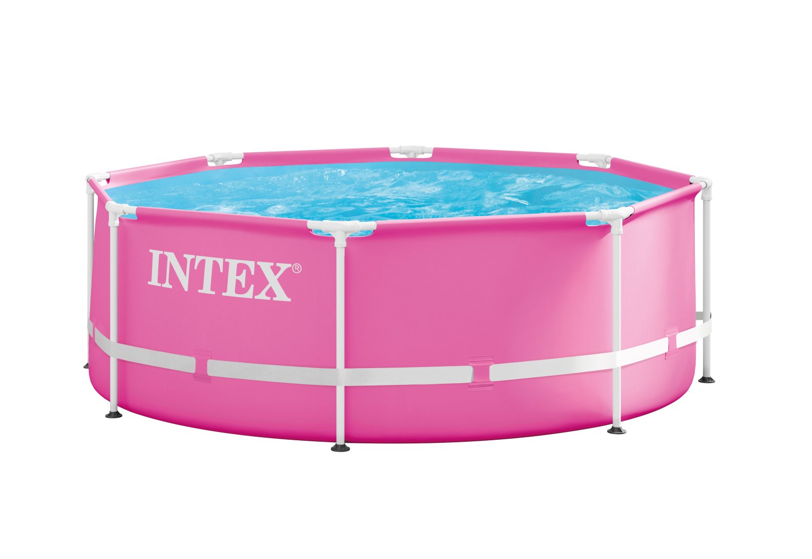 Positively Pink! The INTEX® Pink Metal Frame Pool is a perfect addition for summer. Equipped with innovative T-joints that includes less parts. The best part, no annoying pins required for easy assembly! This pool is ready for water in approximately 30 minutes. Constructed with puncture-resistant, 3-ply material for repeated backyard fun. Escape into your pink summer oasis!